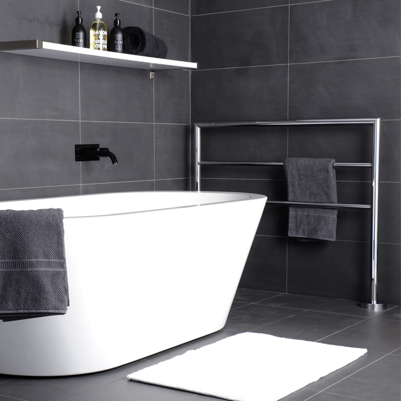 Radiating class and luxury with its minimalist design and practical form, the Free Standing towel rail has been designed to superbly complement open planned bathrooms and free standing baths.