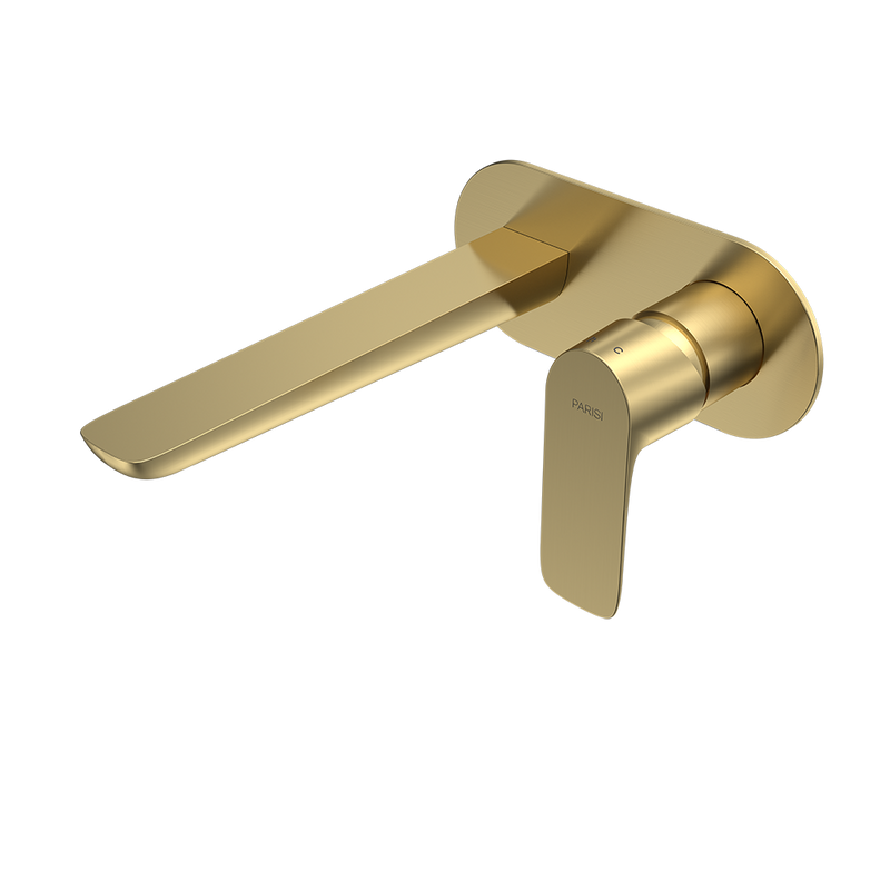 Upgrade your bathroom with the Parisi Slim II Wall Mixer with 190mm Spout on Elliptical Plate in Brushed Brass and experience the perfect blend of style and function.